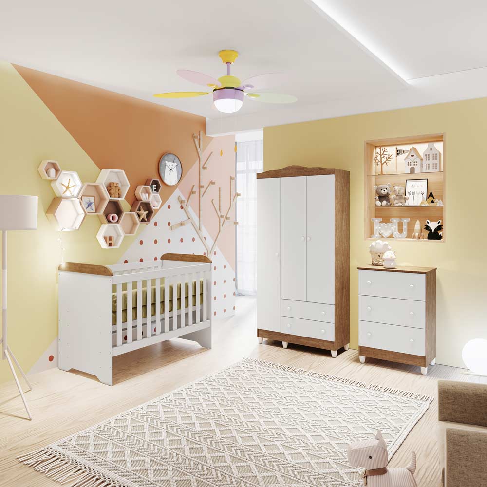 Quarto de Bebê Guarda Roupa 3 Portas com Gavetas Cômoda 3 Gavetas Bianca Berço 3 em 1 Gabrielle Amadeirado Carolina Baby